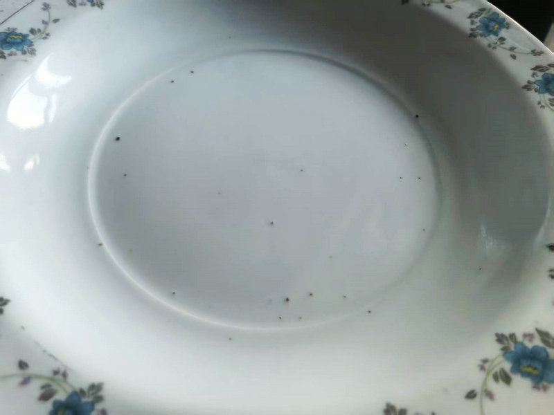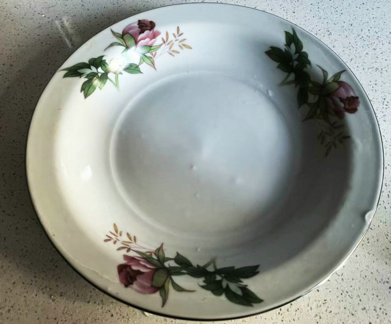 装饰工艺:以简单手绘或印花为主(如第一张盘子的红花纹),图案单一,色彩饱和度低,缺乏细节层次。